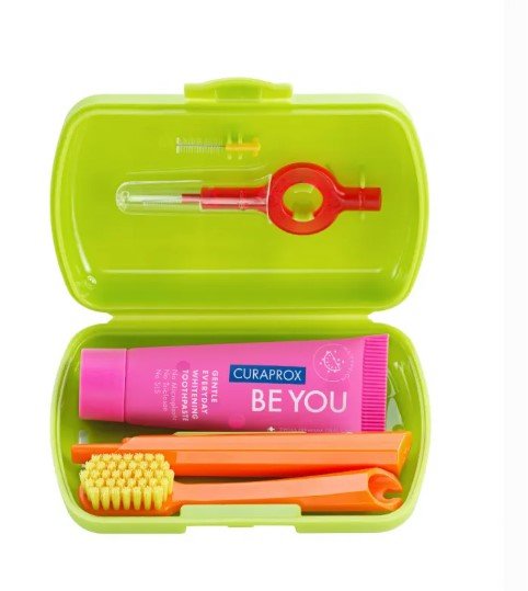 Vibrant and compact oral care set for maintaining a healthy smile during trips.